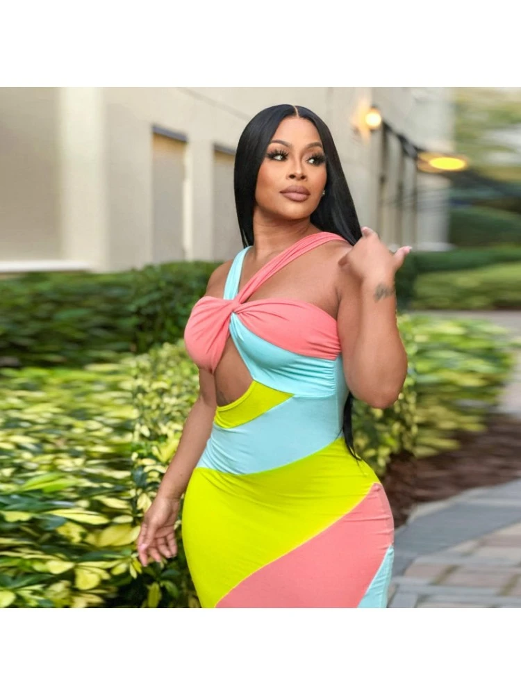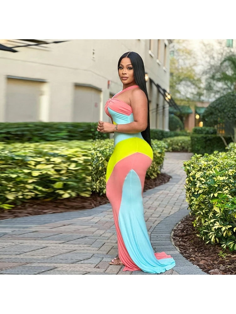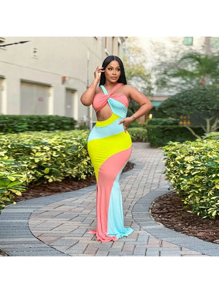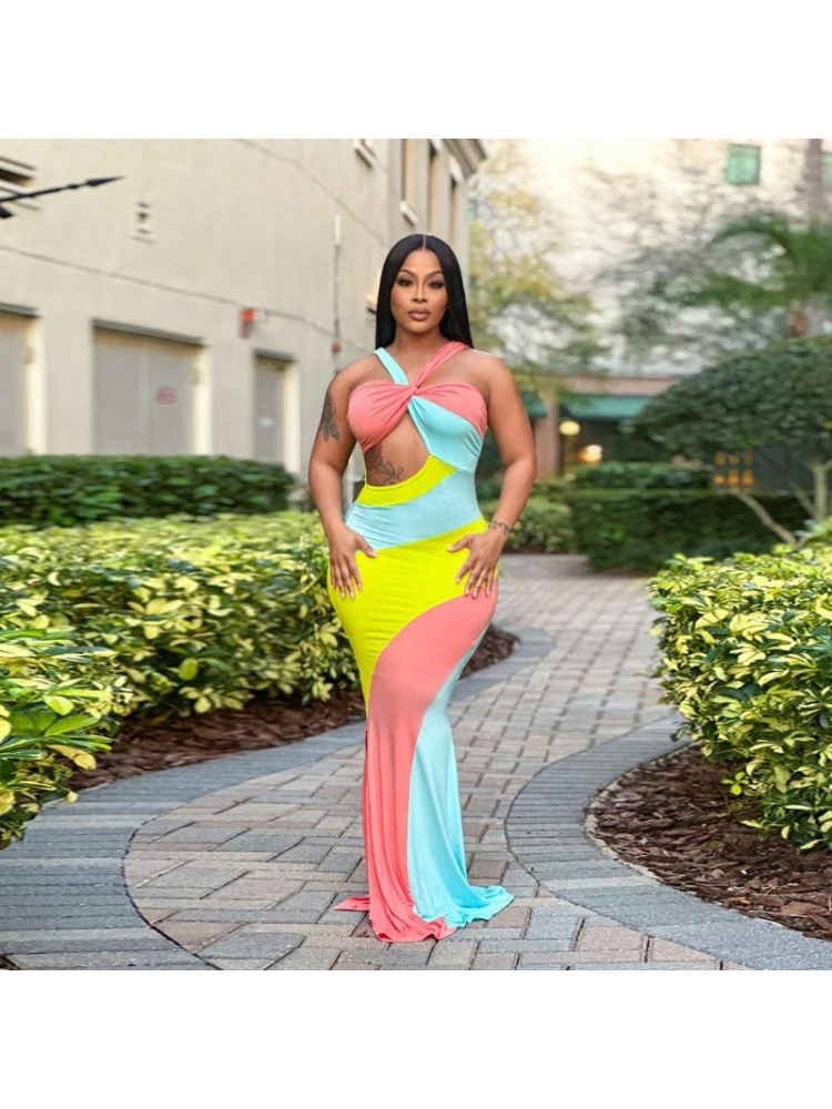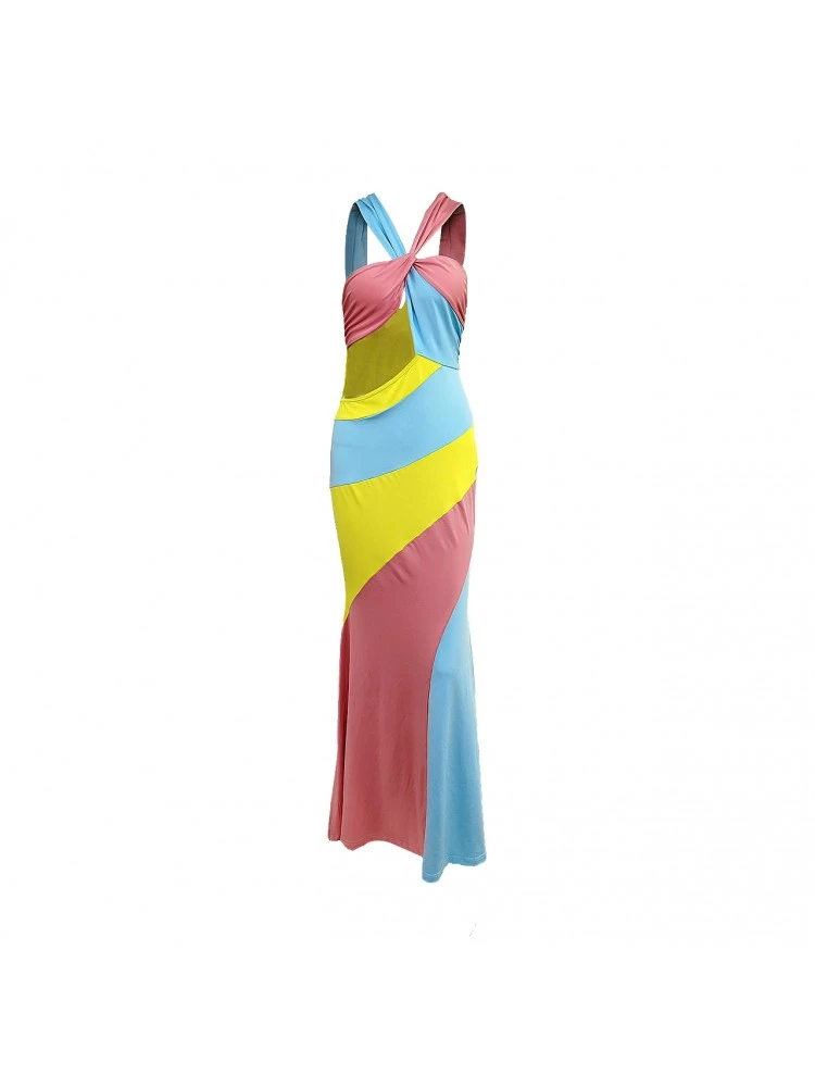Colorblock,Contrast Color,Halter,Hollow Out,Knot/Twist Front,Patchwork,Twist,Color Matching,Pullover,Rainbow