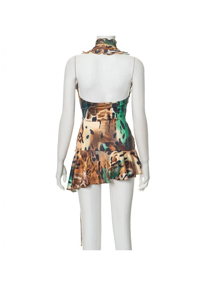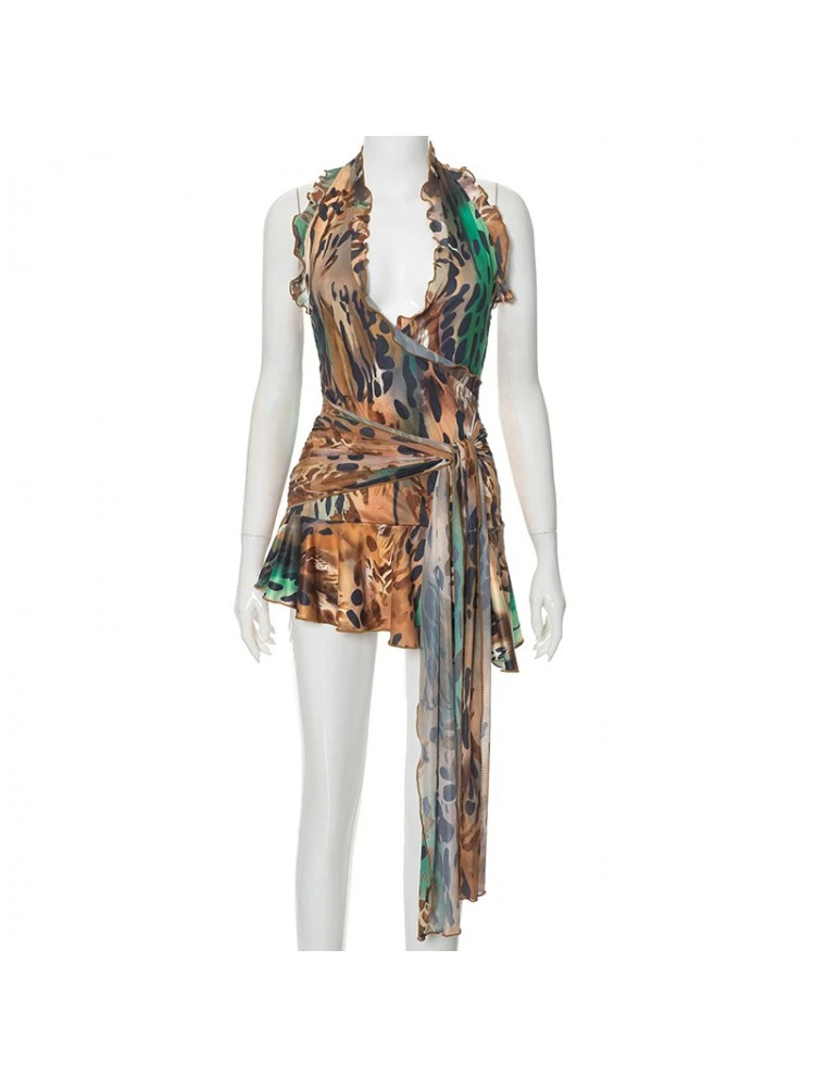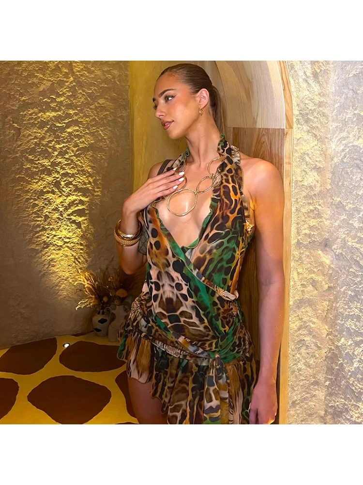 Animal Print,Halter,Irregular,Lacework,Patchwork,Leopard,Leopard Pattern,Ribbons,Pullover